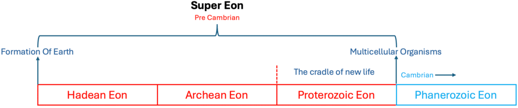 Eons: The largest divisions of time, spanning hundreds of millions to billions of years. Earth’s history is divided into two main eons: the Precambrian (a Super Eon) and the Phanerozoic. After subdivision of the Precambrian, four formally defined eons encompass Earth’s entire history: the Hadean, Archean, Proterozoic, and Phanerozoic. The Hadean, while considered an “informal” division in some contexts, is crucial as it covers Earth’s very beginning.
