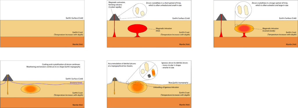 The diagram shows how zircon crystals form within magma during magmatic intrusions, either cooling slowly in the Earth’s crust or rapidly in volcanic extrusions. The size and shape of the crystals vary depending on the rate of cooling. The diagram also shows what happens to these crystals over geological time. After the initial formation, the rocks containing the zircon are uplifted and exposed to weathering and erosion. The durable zircon grains survive this process and are transported to a new location, often a basin, where they accumulate as detrital grains.